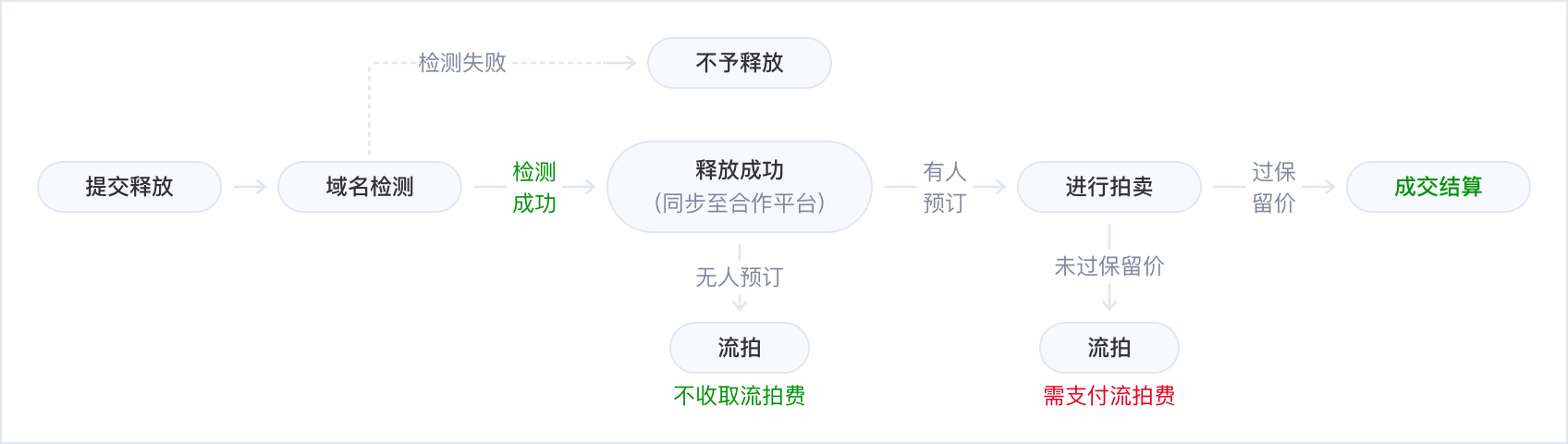 买家出价未过保留价,即域名流拍;流拍费:普通用户$1.00/个,经销商用户$0.50/个;流拍后需间隔45天方可重新提交释放。